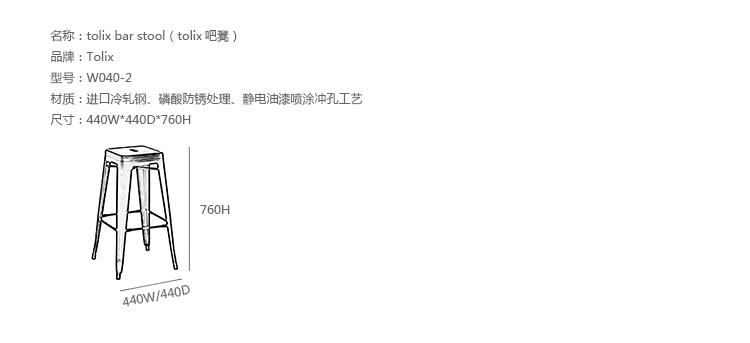 tolix chair(tolix椅)一把有味道、有态度的椅子,据说它最开始被使用在一艘战舰的天气预报房间里,故事的真实性与否不得而知,但是不影响其成为享誉世界的著名设计家具,1934年由Xavier Pauchard设计,早期是作为户外用家具设计,力图展现法式慵懒而闲适的气质,经年而来被全世界时尚设计师所宠爱,从室外扩展到家居、商业、展示等多个用途,而此椅也不负众望在各类空间中均有上佳表现,特别是近年来与混搭、乡村、美式、怀旧、北欧简约、中式等主要装修风格搭配,都呈现出独特的韵味,也被时尚界赞为“百搭第一”椅,可以用在酒吧,餐馆,咖啡馆等等地方,之后通过改进,设计出有扶手版本的tolix armchair(tolix扶手椅),高背版本的tolix high back bar stool(tolix高背吧凳),宽背版本的tolix wide back bar stool(tolix宽背吧凳),及tolix bar stool(tolix吧凳)和tolix mini stool(tolix迷你凳)。制作采用进口冷轧钢、磷酸防锈处理、静电油漆喷涂工艺、坐面为木板或PU海绵坐垫,颜色可选。