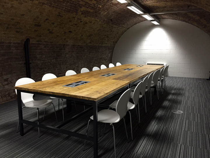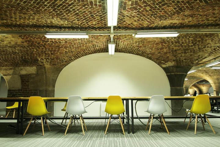 为了打造一个充满活力的企业家社群,内部空间被设计为可移动的模式以适应不断增长的企业需求。室内最为吸引眼球的建筑特色便是建筑自身的拱形天花结构,设计以此为空间布局并配以特殊的照明灯具,以彰显建筑特征。为了与传统的红砖拱顶相配,室内慷慨的选用1.2米宽的实木长桌为个人与团队合作提供充足的工作空间。