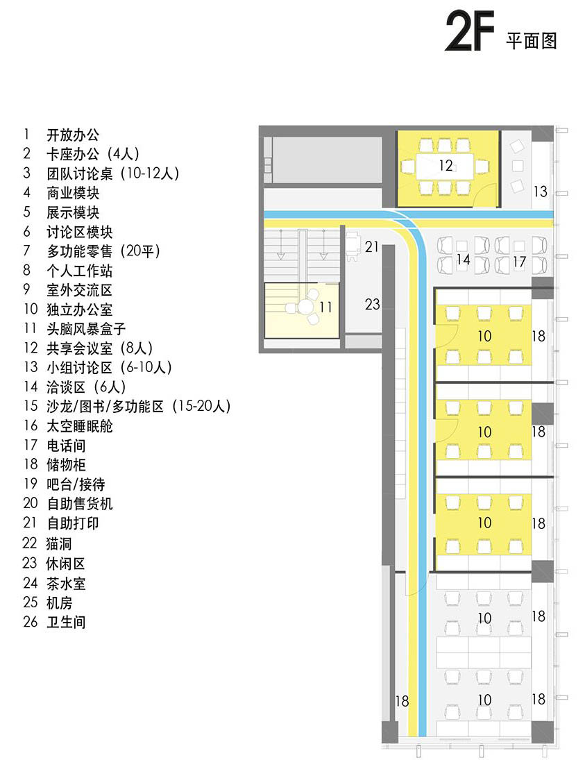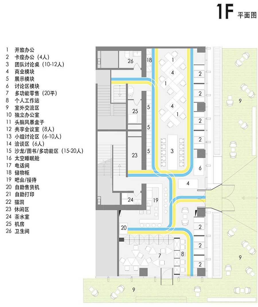 首层规划原是用作商铺,因此这里也为大楼提供基础商业服务功能。首层除了有提供服务和饮品的吧台,在西侧还配置了相对独立的零售区。零售区有独立出入口,并通过家具组合与主体空间分隔。通常吧台是联合办公的互动区,但在这里还有自由拼接的三角桌供个人或团队拼合使用。在特定的时间,比如早晨或周末,这里还作为短时零售以及展示活动使用,成为小型创业团队的产品展示和推广活动的绝佳场所。