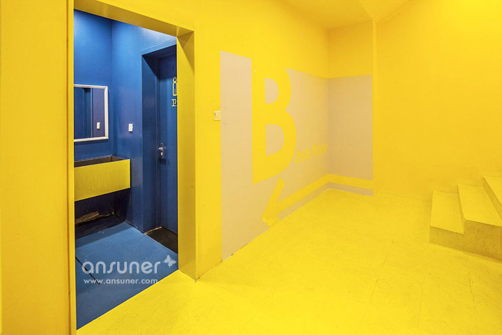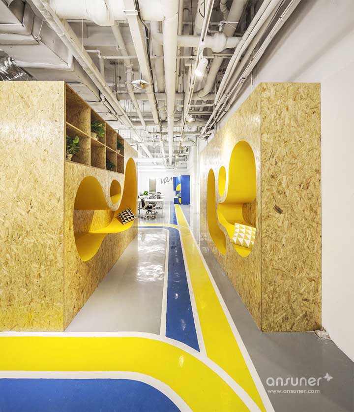 我们知道在办公空间中,地下室往往因为不便的地理位置而处于劣势。然而在本案中,设计师将通往地下的楼梯间整体喷成了明快的黄色,即增添了空间活力,又具有强烈的视觉导向性。明黄色的楼梯踏步延伸至地面开口,自然而成的大型台阶成为创业团队路演和产品发布的场地。地下室的公共空间还设计了有趣的“猫穴”和“睡眠舱”,供团队社交、放松和短时休憩。
