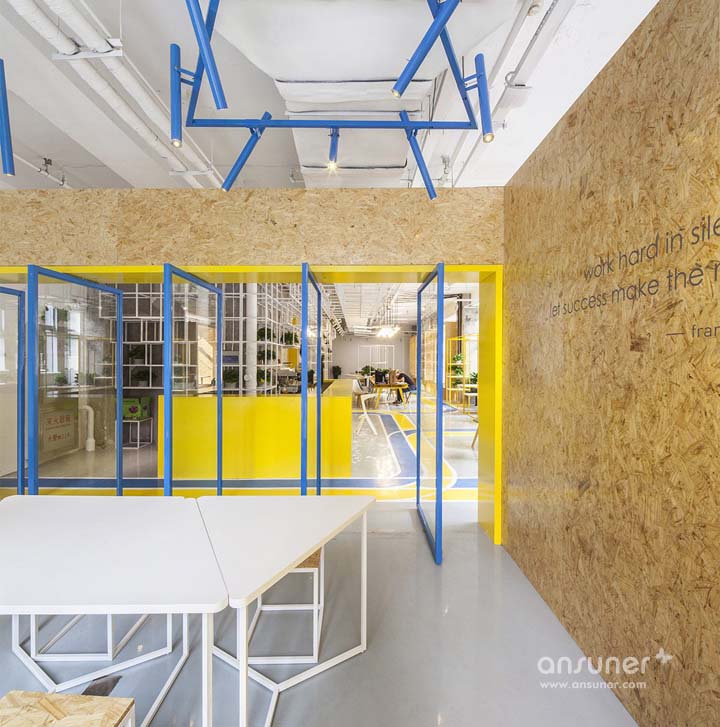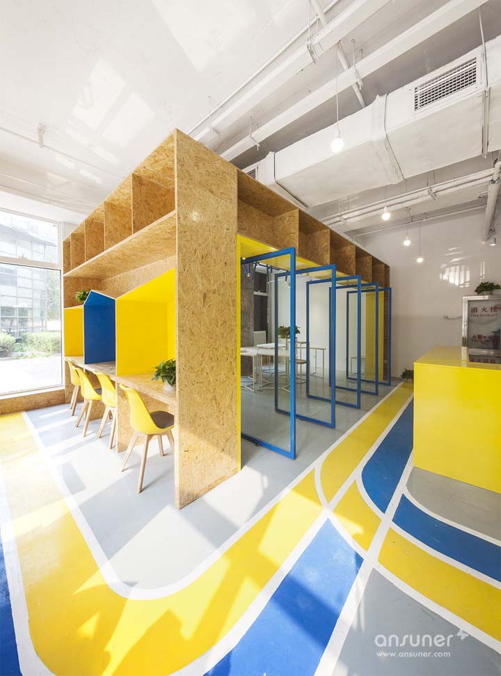 在空间架构上,设计以“植入”小盒子的方式营造较为私密的会议室和办公室。如在二层和地下室,以欧松板制作的模块化家具界定了空间格局;以2.4米高的透明玻璃分隔出独立办公室。独立空间明亮的地面色彩也再次强化“植入”的概念表达。秉承这一设计思路,远离墙体的家具设计亦暗示了联合办公空间的即时性、灵活性和可变性。