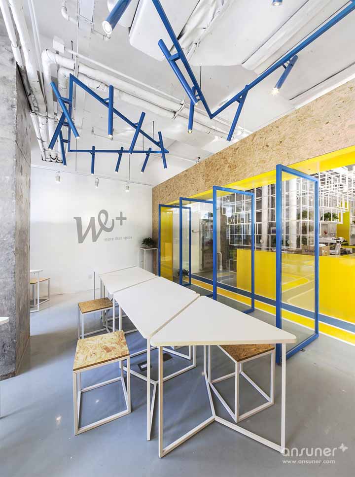We+联合办公空间面积约800平方米,分为首层、二层和地下室。在项目初期,设计团队采用以调研为基础的数据分析设计方式,通过大量的案例调研与分析,最终推导出一个灵活多变的共享空间模式。