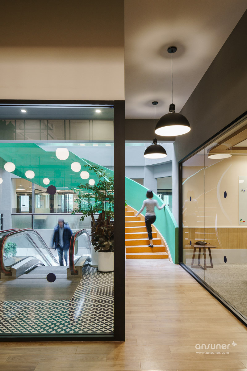 推开双开玻璃大门,一面圆形玻璃穹顶跃然眼前,阳光透过玻璃穹顶洒满整个中庭。为突出中庭的空间感,WeWork设计团队采用了简洁的设计风格,旨在将来访者的注意力集中在沿着中庭盘旋而上的景观楼梯上。充满生命力的绿色楼梯围栏和明亮跳跃的黄色阶梯将二楼和三楼办公空间连接起来。设计团队希望会员能够在使用楼梯的过程中增加互动的频率,与此同时利用雕塑一般的盘旋楼梯设计,避免过于空旷的中庭视觉。