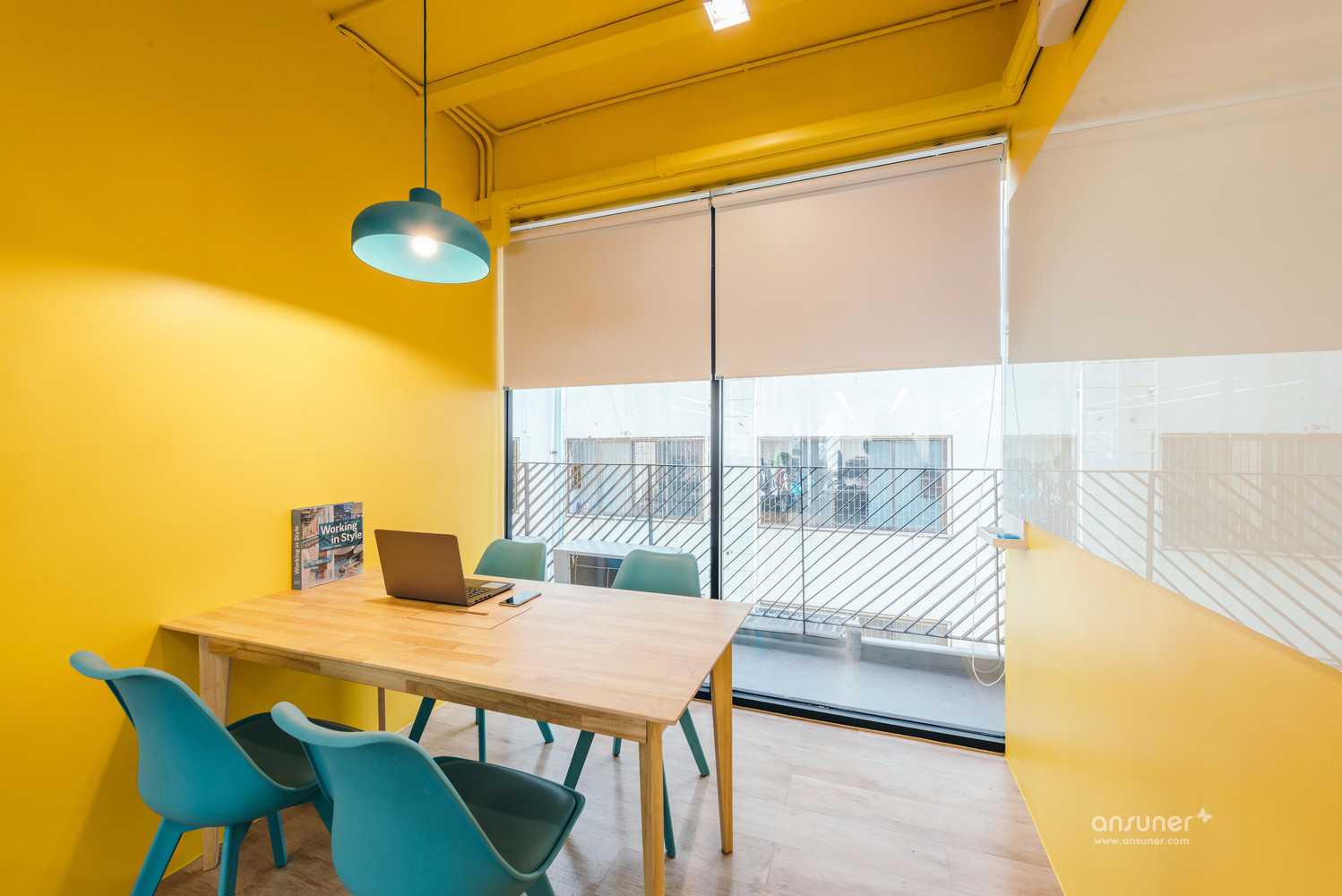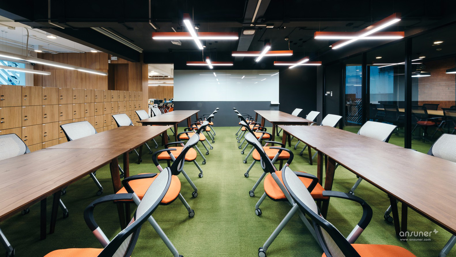 另一个有趣的方面就是该建筑的立面由百叶窗组成。这个铝制的百叶窗立面以对角线的方向设立来展现这个公司的特点并非简单的直线如此普通的设计。这种延续的对角线试的百叶窗提供了一种生气勃勃且流畅的感觉。因此在楼层之间也没有阻挡的框架。