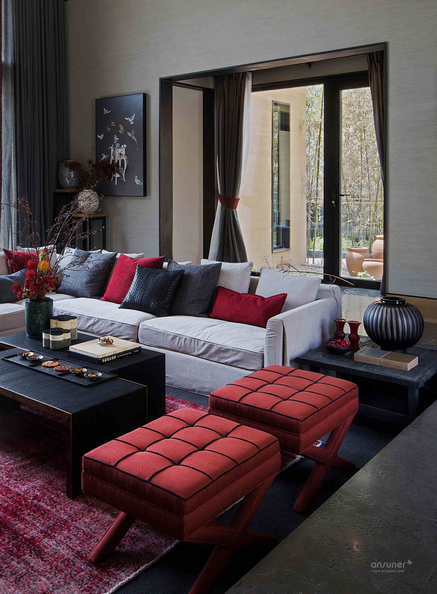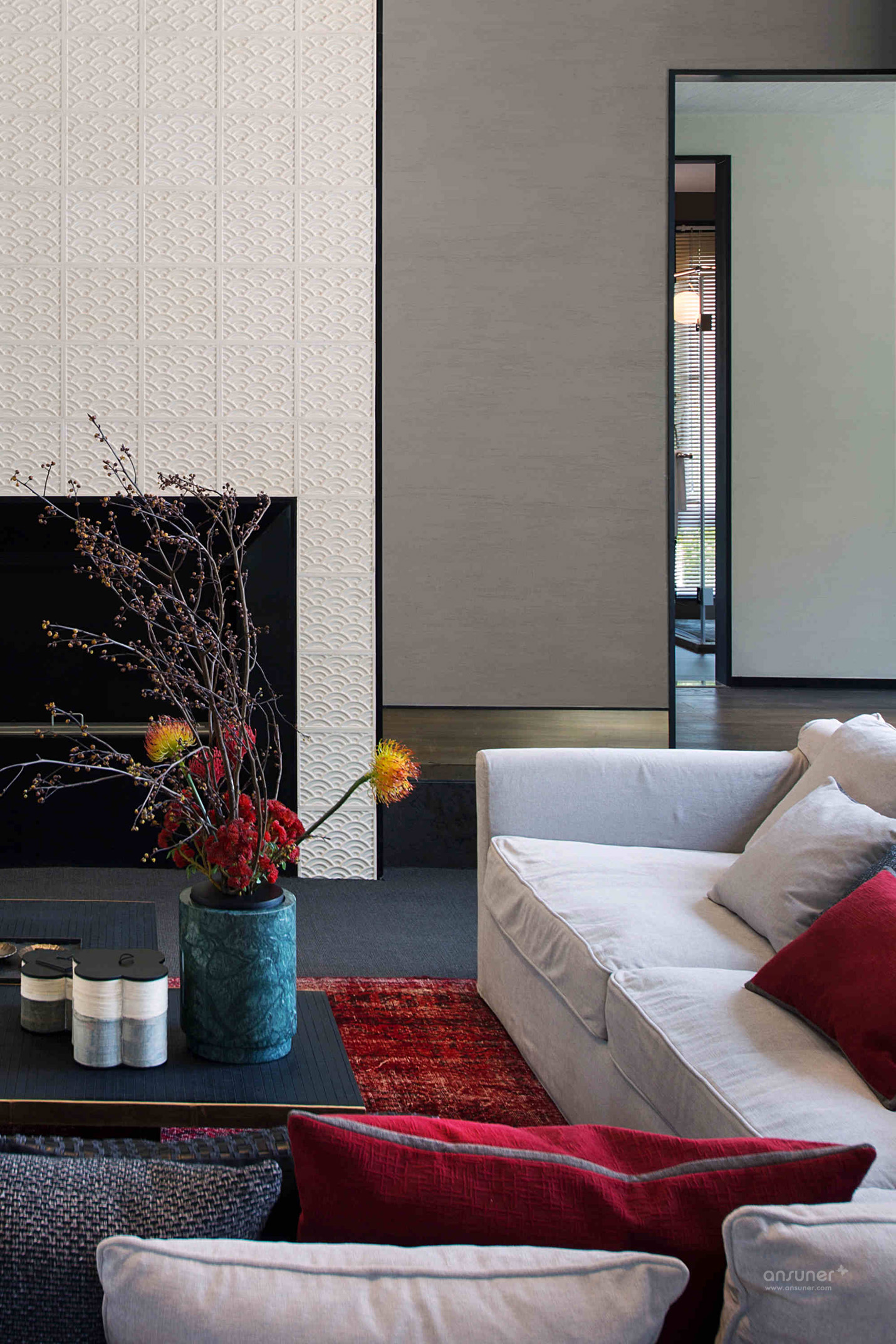 客厅:软装设计上,色彩浓重与用材粗放的矛盾组合,不拘一格,在隐藏的静室之下掺杂了强烈而又煽情的色彩视觉。细节处低调嵌入优雅的中国传统纹样,以打破重组的独特手法,在空间里造成恰当的碰撞,粗粝的花樽中,娇俏的花枝摇曳,明艳中还带有丝丝缕缕的纯真。