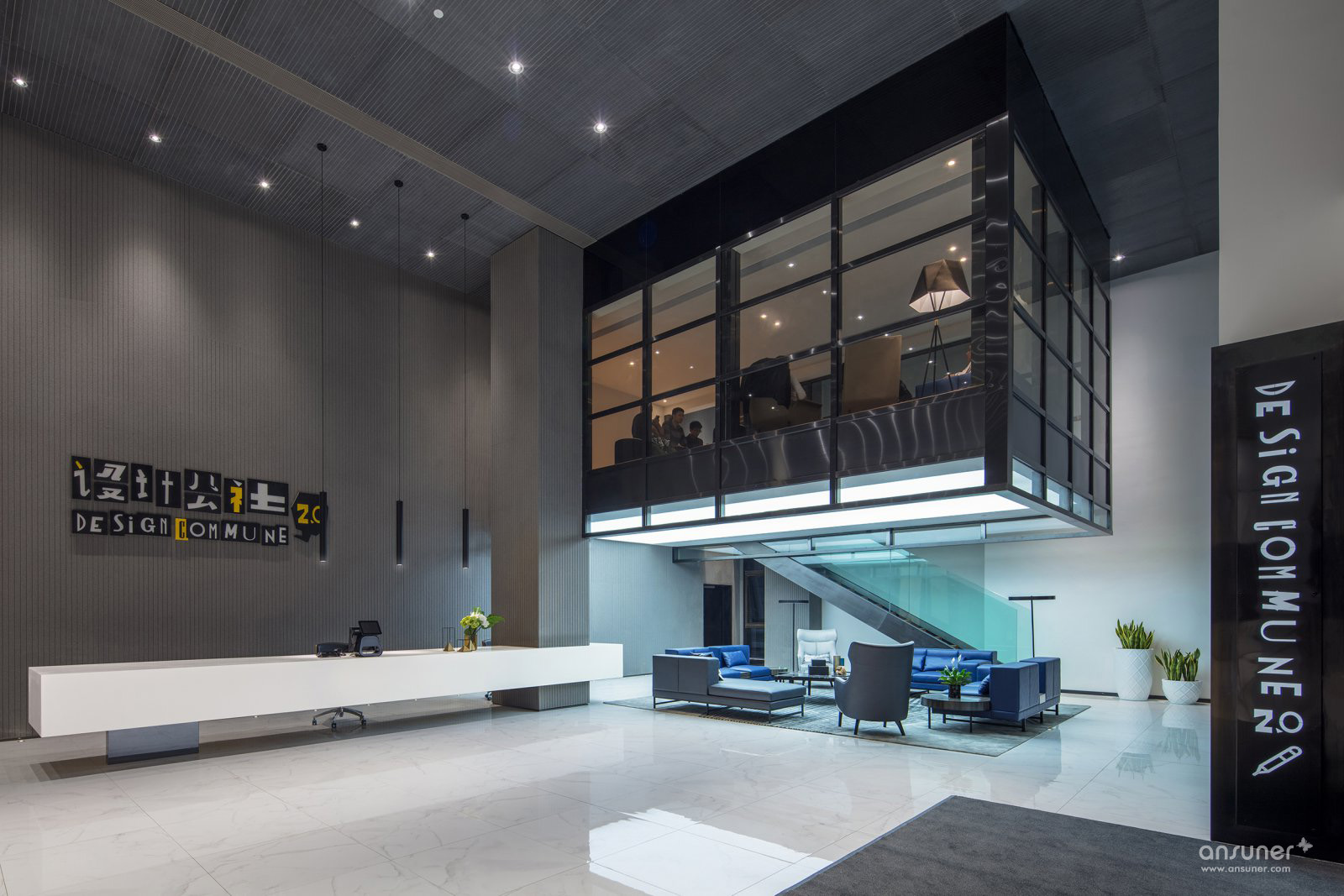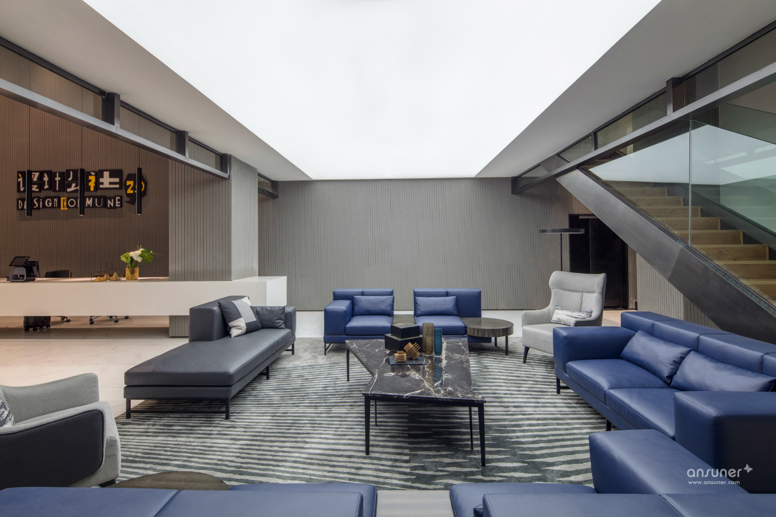一层大堂接待空间注重商务感受,因此以黑、白及高级灰色调为主,沉稳中偶尔又跳出一些蓝、黄色的活泼。设计手法上为了搭配空间的层高和布局,体现未来感与创新感,运用了很多几何与线条的元素,无论是在家具款式、吊顶装置还是饰品中都可以看到。